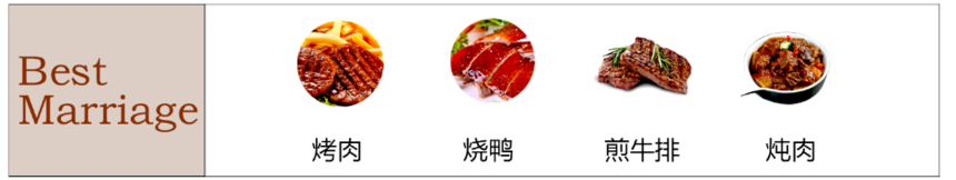 【侍酒建议】: 餐食搭配:牛排、烧烤、肉类。